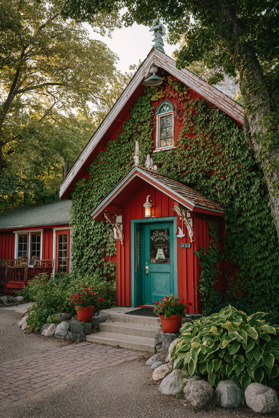 The restaurant’s sod roof supports a small herd of goats that became Door County’s most photographed attraction, drawing crowds who gather on the sidewalk below.