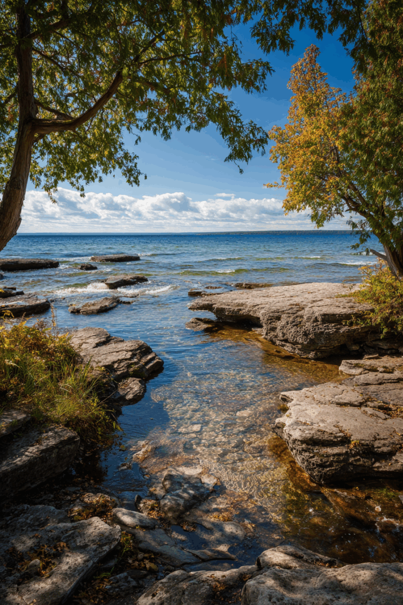 The park’s towering limestone bluffs rise majestically above Green Bay, offering panoramic views that stretch endlessly across sparkling blue waters.