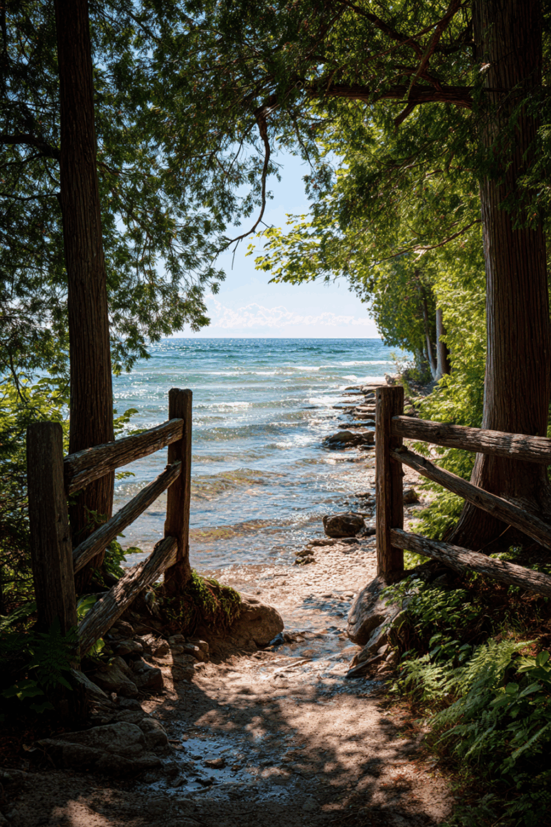 The Hidden Bluff Trail leads you through dense cedar forests to spectacular Lake Michigan overlooks where limestone cliffs drop dramatically into crystal-clear waters.