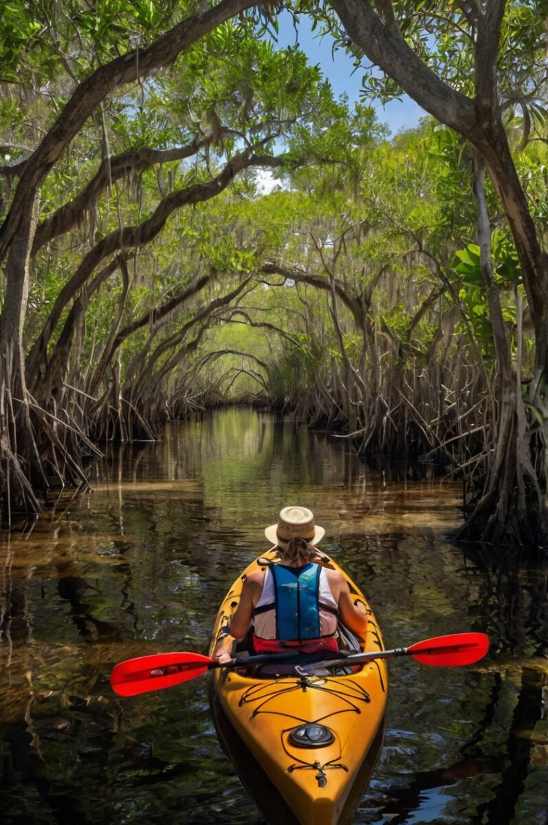 These tunnels serve as nurseries for countless fish species, so you’ll see juvenile snappers, tarpon, and other marine life darting beneath your kayak.
