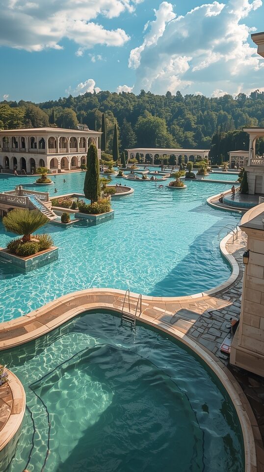 Imagine soaking in 38°C outdoor pools while steam rises around you and locals play chess on floating boards.