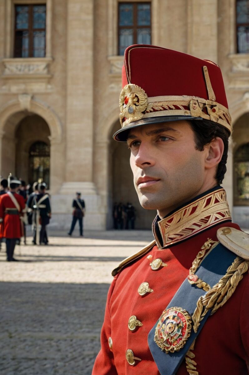 The Carabiniers du Prince march in crisp formation wearing white summer uniforms or dark winter ones depending on the season, complete with white belts and serious expressions.