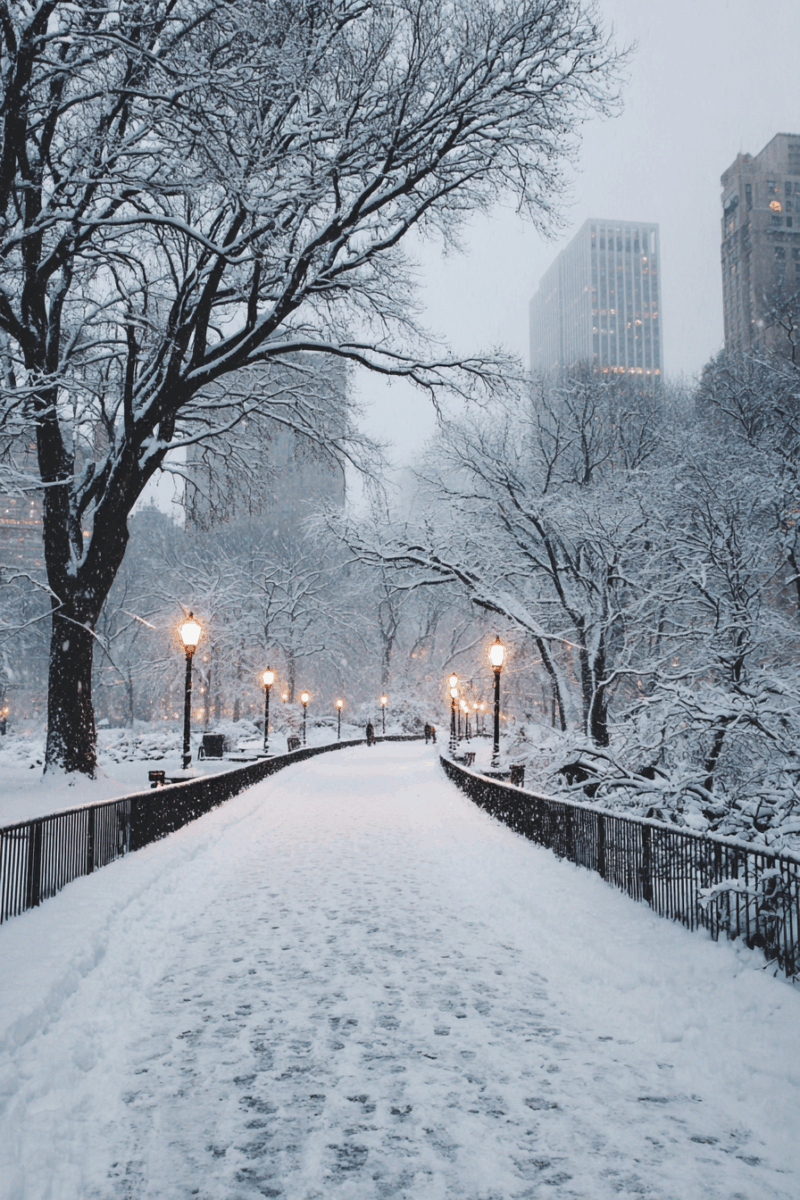 Central Park draped in fresh snow creates a serene escape from the city’s holiday hustle, where peaceful paths wind through a landscape that looks like a classic Christmas card.