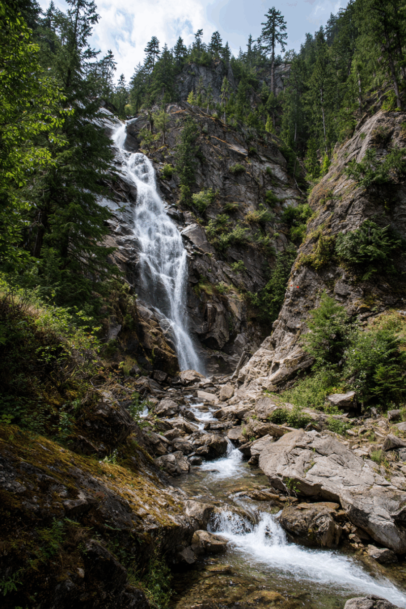 The hike to this waterfall takes you through old-growth forest and alongside rushing creeks that build anticipation for the main event.