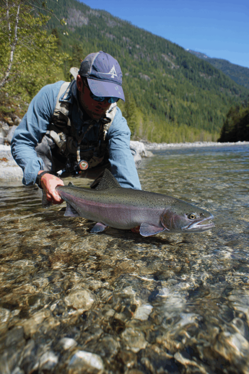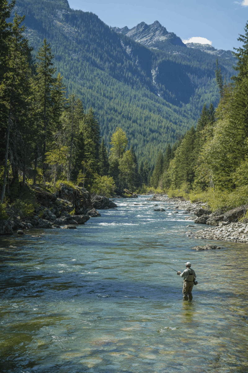The clear mountain water means fish can see you easily, requiring stealth and careful presentation to avoid spooking your targets.