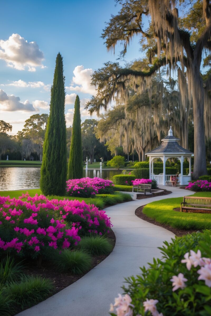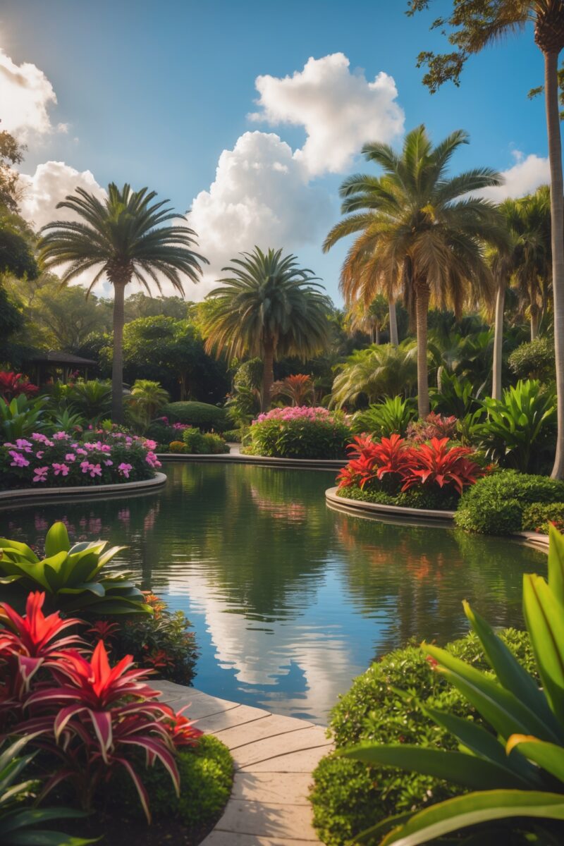 A 50-acre tropical and floral paradise with winding paths, rose gardens, and seasonal blooms.
