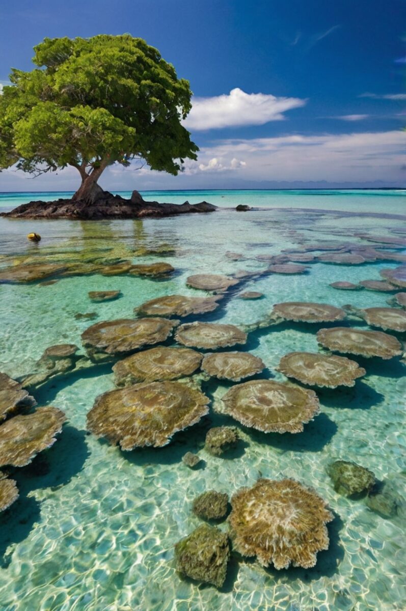 Giant clams over three feet across filter the crystal-clear water, creating natural aquariums where colorful fish dart between massive shells that can live over 100 years.