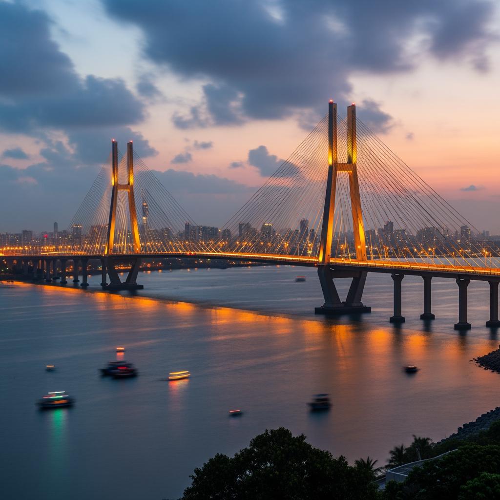 The bridge is lit up, the ocean is on both sides, and Mumbaiโs skyline glows in the distance.