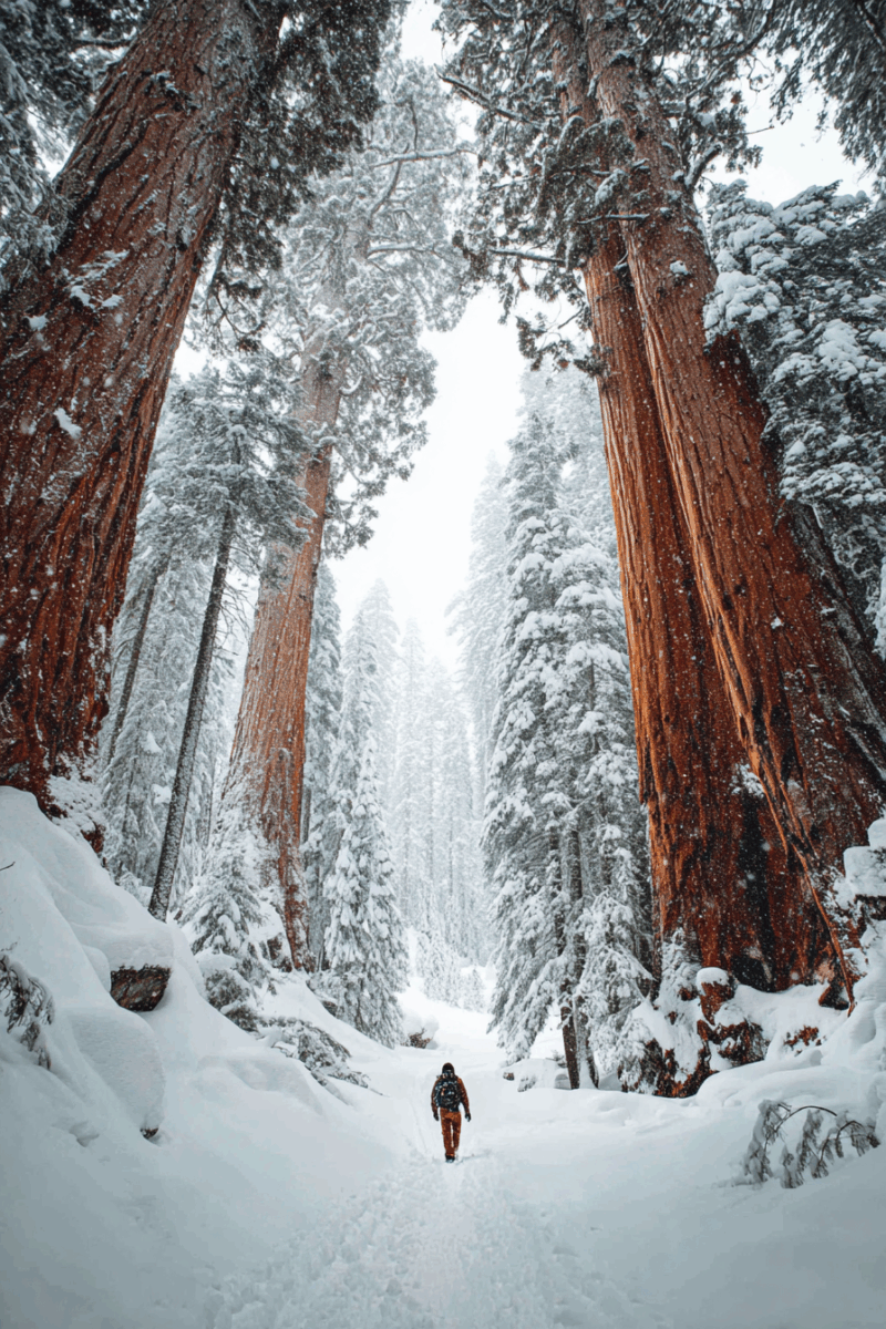 The Giant Forest takes on an entirely different character when blanketed in snow, creating a winter wonderland that feels like stepping into a fairy tale.