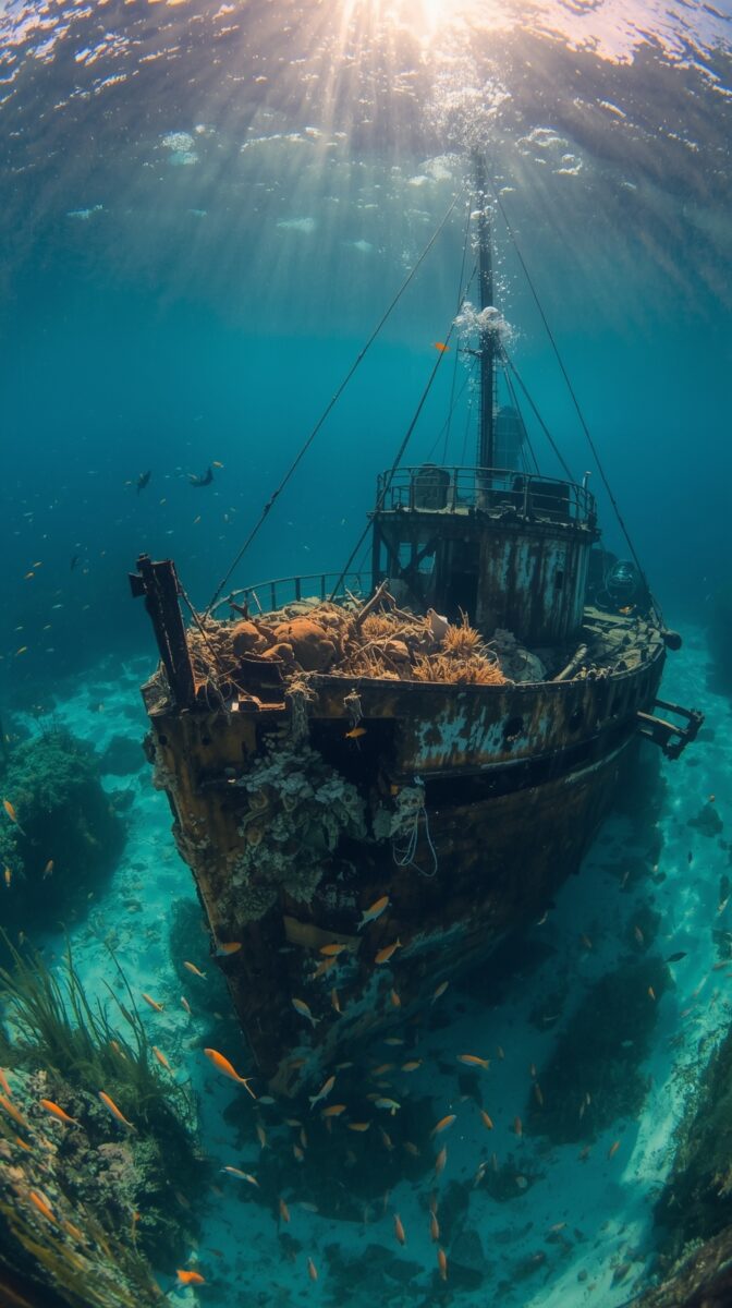 Itโs a massive ship sitting upright on the ocean floor, covered in coral and swarming with fish.