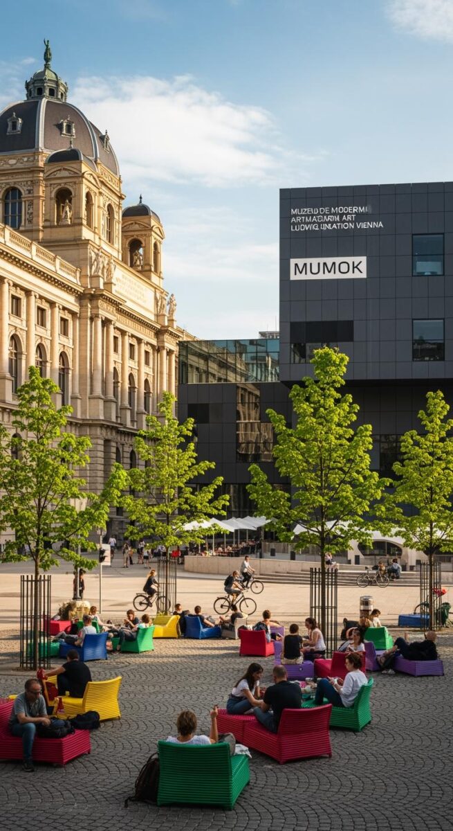 The MuseumsQuartier is a remarkable ensemble of museums, cafes, restaurants and bars inside former imperial stables designed by Fischer von Erlach.