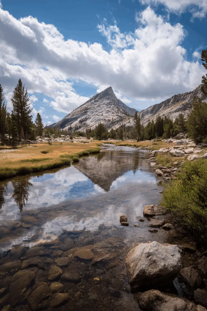 Your first glimpse of Cathedral Peak rising above the treeline will stop you in your tracks, as this granite spire seems to pierce the sky with its dramatic pointed summit.